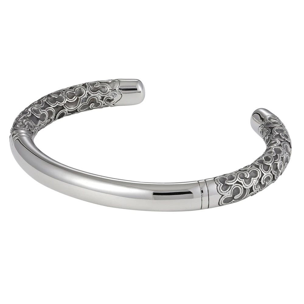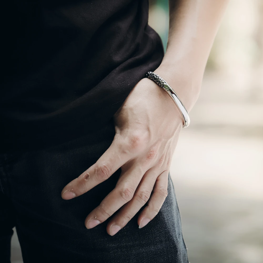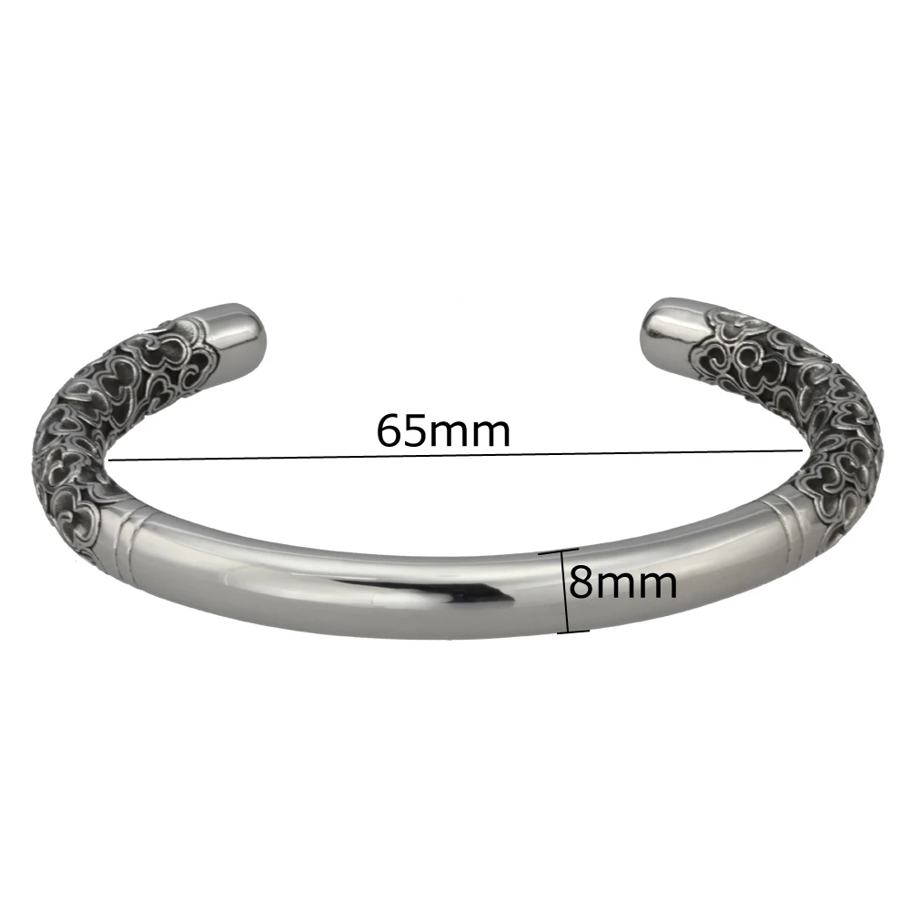 Oceľový pevný náramok na ruku. Povrch náramku je leštený so vzorom. Náramok má vnútorný priemer 65m, priemer "tela" náramku 8mm.