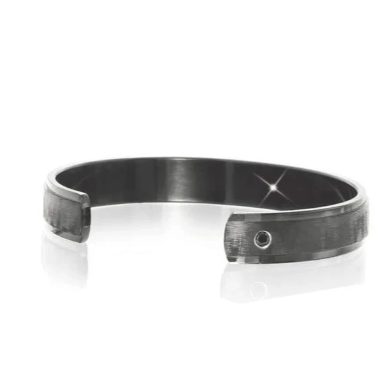 Pevný pánsky náramok z chirurgickej ocele. Povrch náramku je upravený čiernou PVD farbou. Kraje náramku sú leštené, stred je matný. Náramok je široký 10mm. Vnútorný priemer náramku 65mm. Do náramku je zasadený čierny zirkón.