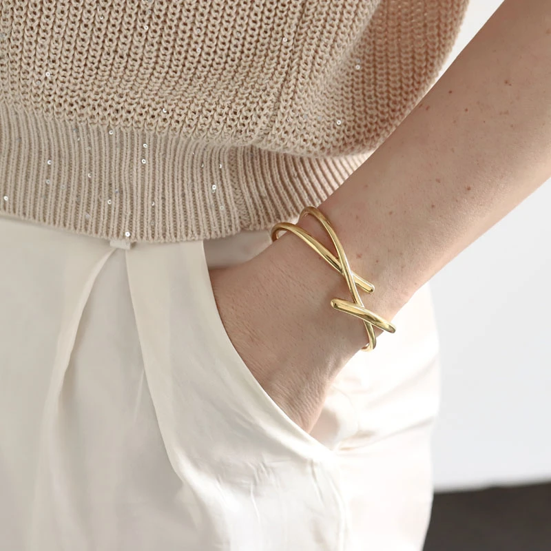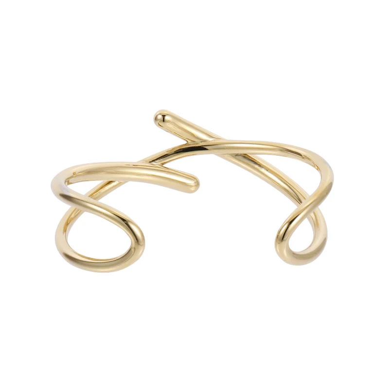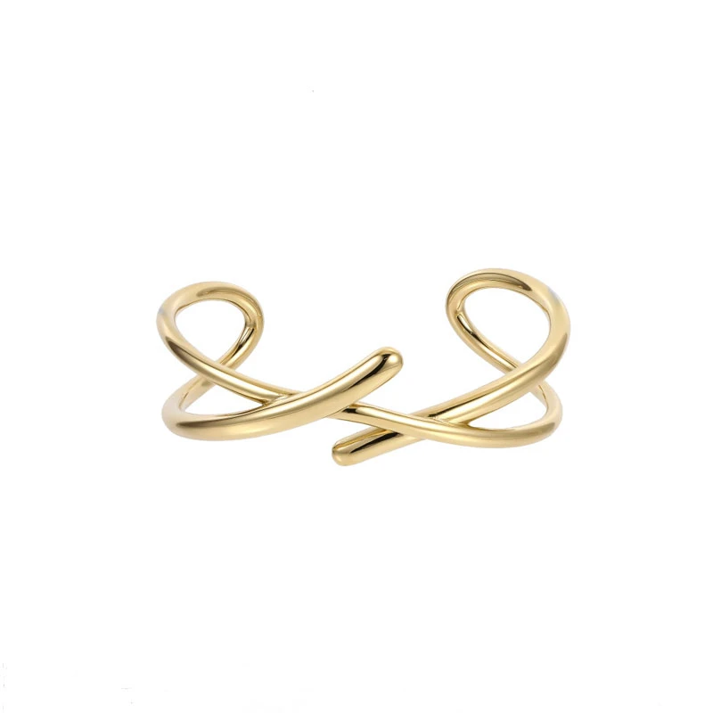 Pevný náramok z chirurgickej ocele nepravidelného tvaru. Povrch náramku je leštený pozlátený technológiou PVD. Stred náramku je široký 22mm, strany náramku sú široké 20mm, vnútorné rozmery: šírka 60mm, výška 45mm. Rozmery náramku nájdete zobrazené na podpornej fotografii.