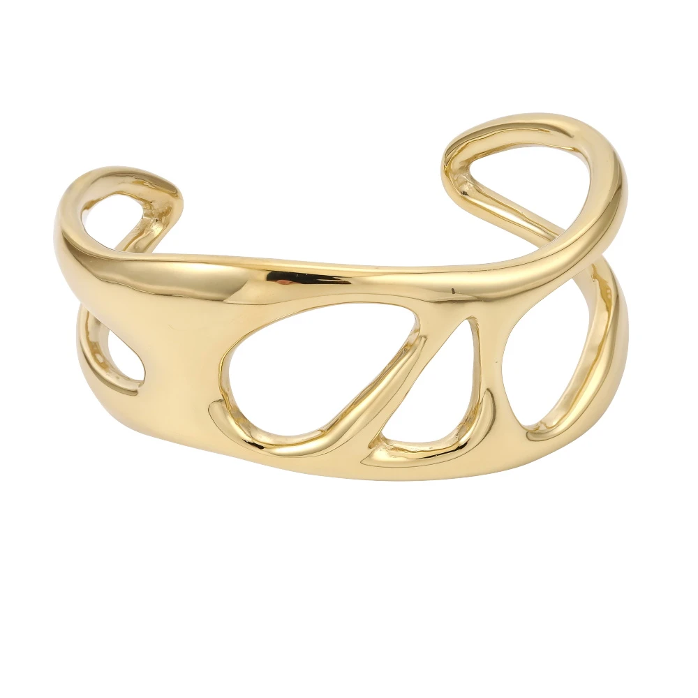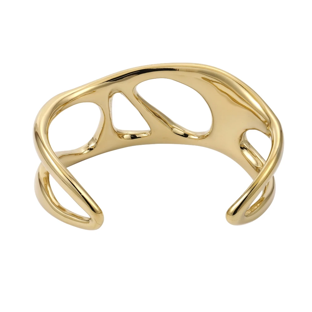 Pevný náramek z chirurgické oceli nepravidelného tvaru. Povrch náramku je leštěný pozlacený technologií PVD. Střed náramku je široký 30mm, strany náramku jsou široké 25mm, vnitřní rozměry: šířka 60mm, výška 50mm. Rozměry náramku najdete zobrazené na podpůrné fotografii.