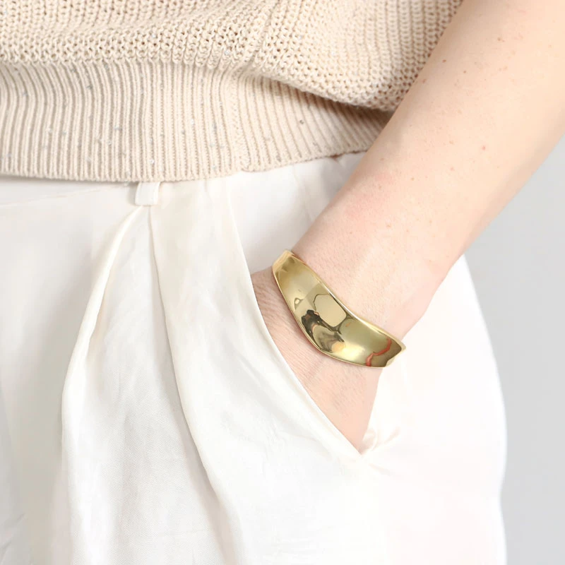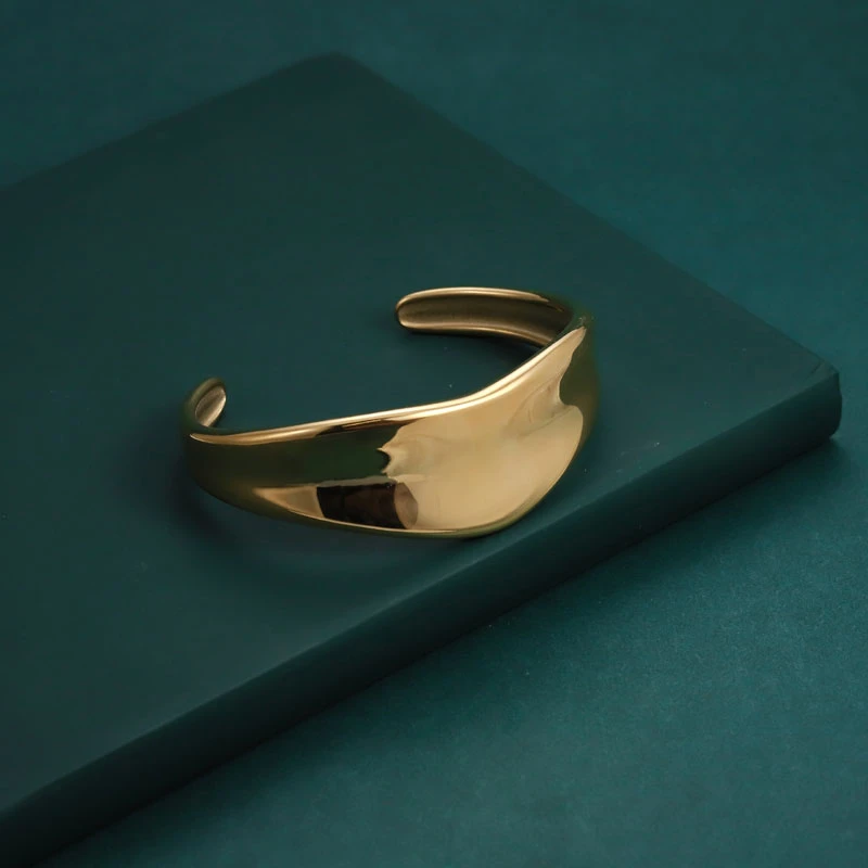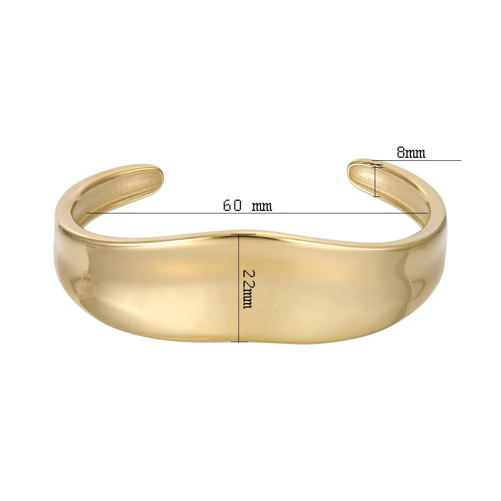 Pevný náramok z chirurgickej ocele nepravidelného tvaru. Povrch náramku je leštený pozlátený technológiou PVD. Stred náramku je široký 22mm, strany náramku sú široké 8mm, vnútorné rozmery: šírka 60mm, výška 45mm. Rozmery náramku nájdete zobrazené na podpornej fotografii.