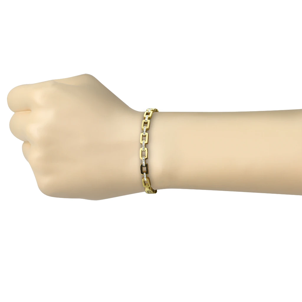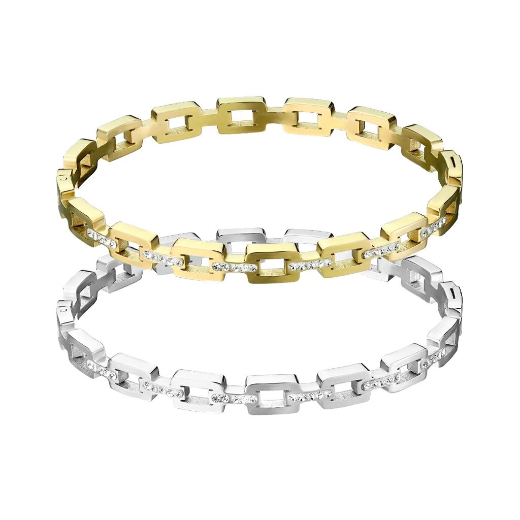 Pevný náramok so zirkónmi z chirurgickej ocele. Povrch náramku je leštený. Náramok je široký 6 mm, vnútorný priemer náramku 58 mm.