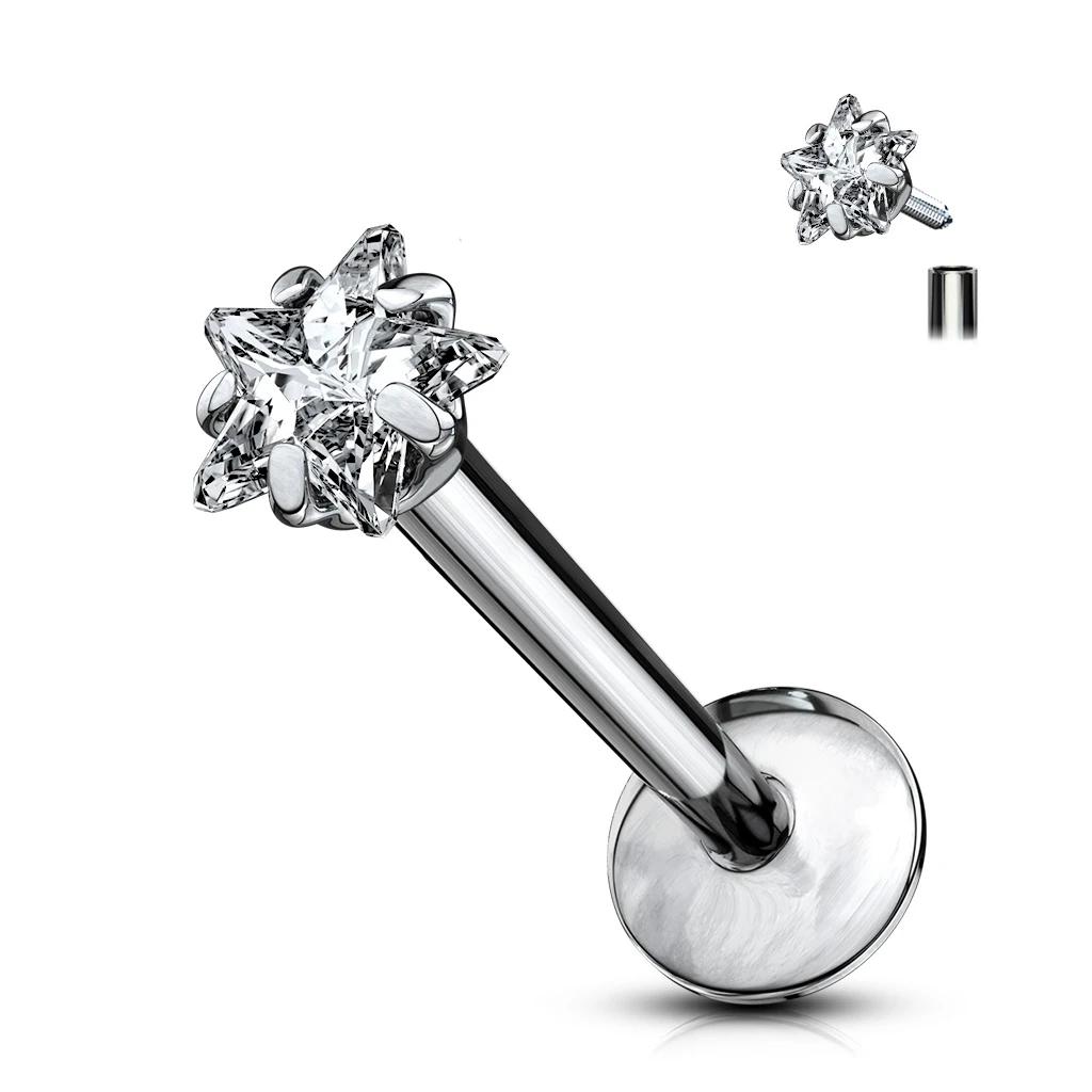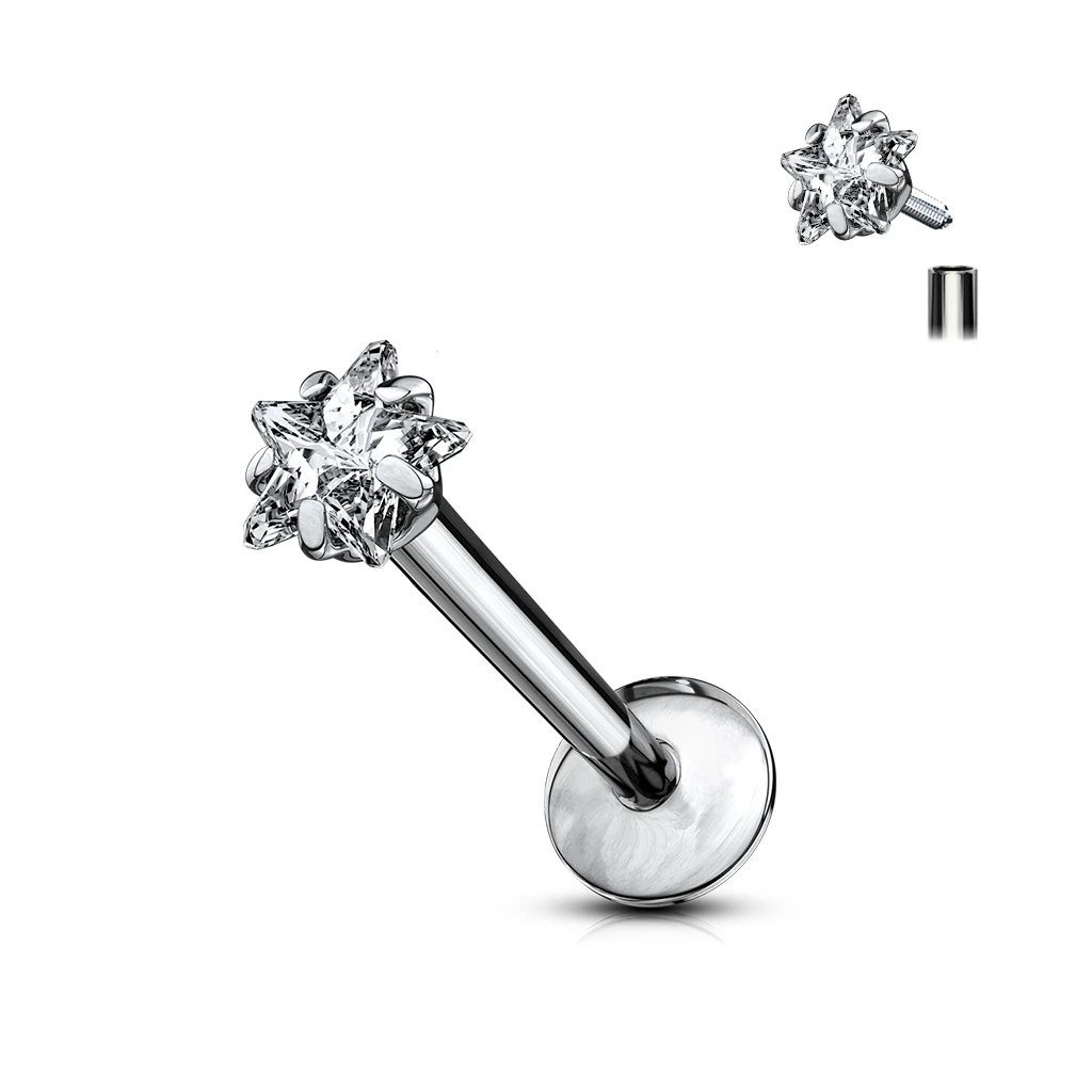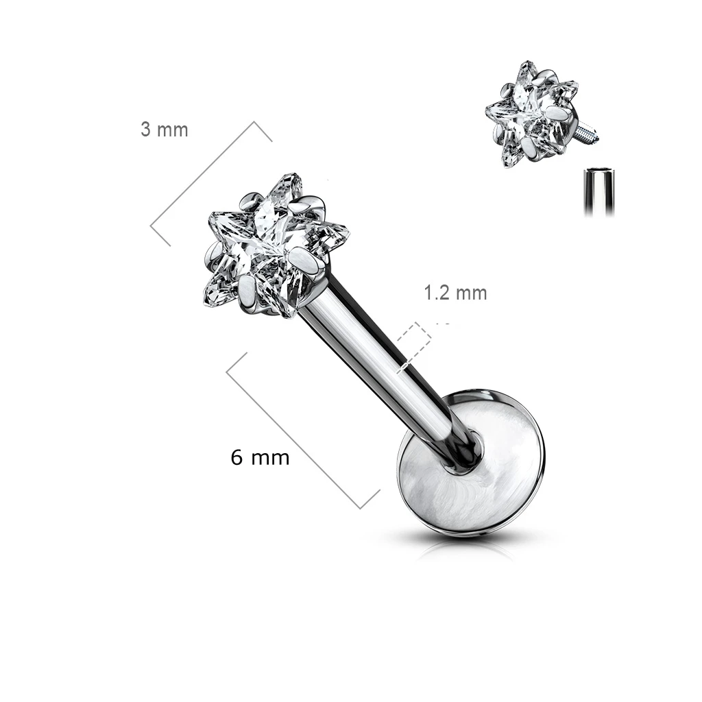 Titánový piercing do brady so zirkónom v tvare hviezdy. Piercing je vyrobený z titánu s označením 6AL-4V-ELI ASTM F-136, ktorý je zvlášť vhodný na výrobu telových implantátov. Driek je dlhý 6 mm, priemer drieku 1,2 mm, ozdoba s hviezdou má priemer 3 mm.