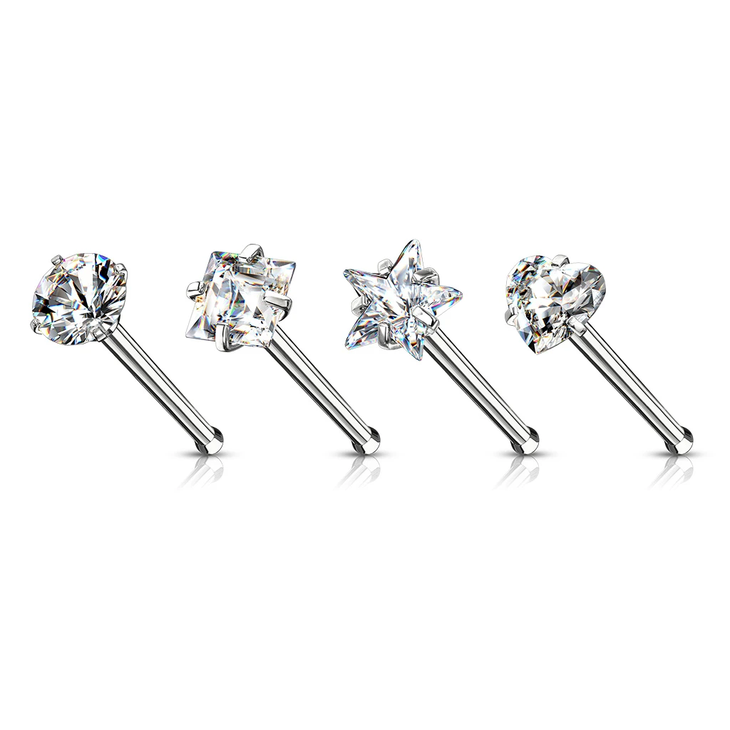 Piercing nosa z chirurgickej ocele so zirkónom v sade 4 kusov. Driek piercingu má priemer 0,8mm, dĺžka drieku 7mm. Ozdoba so zirkónom má priemer 2,5mm.