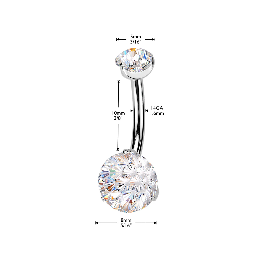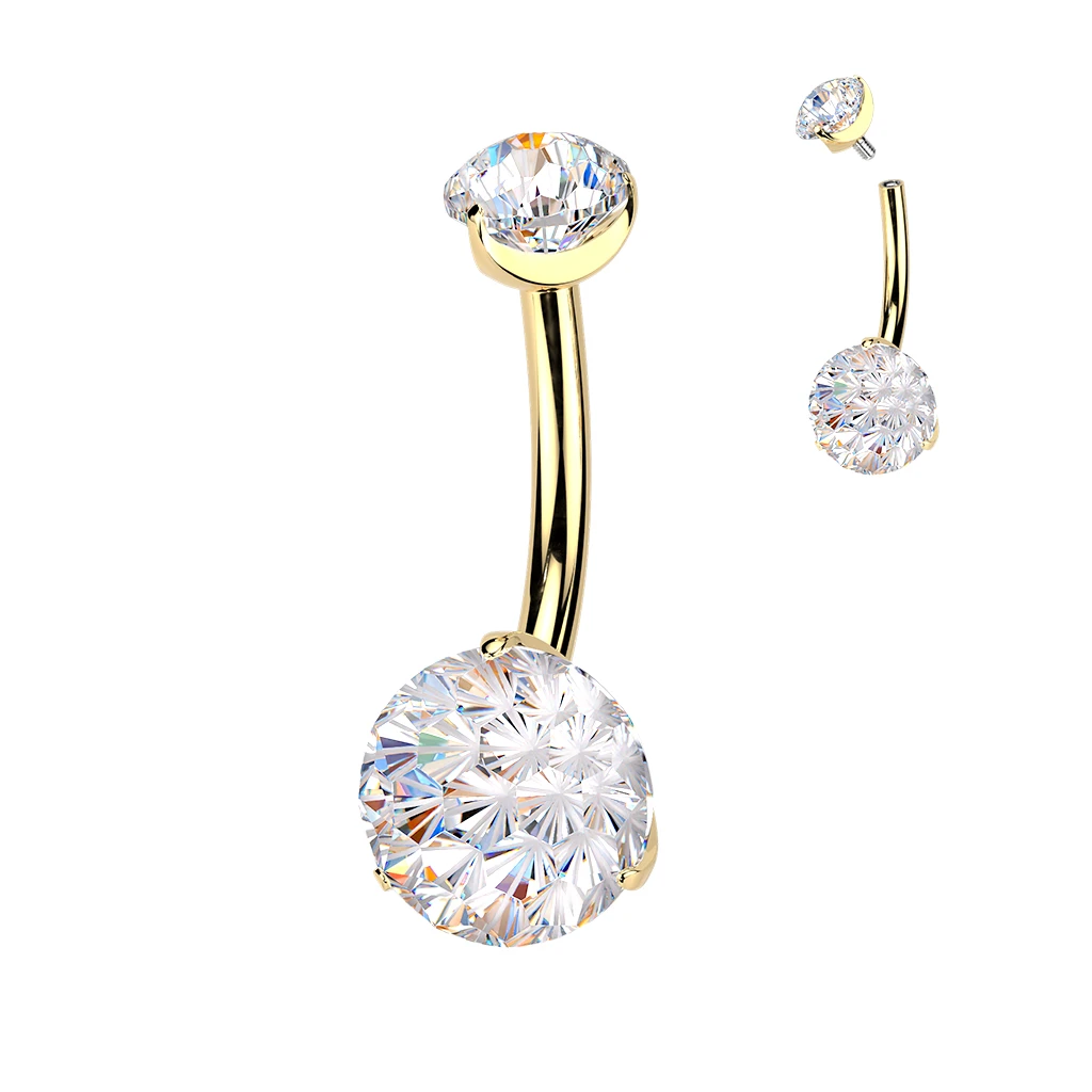 Piercing do brucha vyrobený titánu ASTM F136, ktorý sa bežne používa pri výrobe telových implantátov. Piercing je ozdobený žiarivými zirkónmi. Driek piercingu je dlhý 10 mm, priemer drieku 1,6 mm. Vrchná skrutkovacia ozdoba so zirkónom má priemer 5 mm, spodná ozdoba má priemer 8 mm.