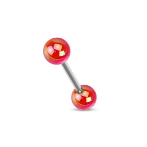 Piercing jazyka. Piercing má driek z chirurgickej ocele 316L. Guličky piercingu sú z bioplastov. Driek piercingu je dlhý 16mm, priemer drieku 1,6 mm. Guličky zdobiace piercing majú priemer 6mm.