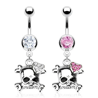 Piercing do pupku. Driek piercingu je z chirurgickej ocele 316L. Priemer drieku 1,6 mm, dĺžka drieku 10mm, priemer vrchnej guličky 5mm, priemer spodnej guličky s kamienkom 8mm. Piercing má ozdobu "pirátskej lebky" v pravej hornej časti má lebka srdce vykladané zirkónmi. Rozmer ozdobné lebky 17 * 15mm. Ozdobná lebka je porodiovaná bižutérie.