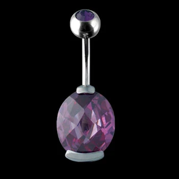 Piercing pupku. Piercing je celý z chirurgickej ocele 316L. Piercing je ozdobený veľkým fialovým kameňom s rozmerom 15 * 12mm. Driek piercingu je dlhý 10mm, priemer drieku 1,6 mm, priemer guličky 6mm. Krásny piercing do pupku z chirurgickej ocele.