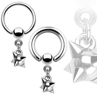 Piercing do ucha. Piercing je z chirurgickej ocele 316L. Povrch piercingu je leštený. Rozmery piercingu: priemer drieku 1,6 mm, priemer krúžku 13mm, priemer guličky s ozdobou 5mm, dĺžka ozdoby piercingu 13mm, priemer guličky s hrotmi 9mm vrátane ozdobných hrotov.