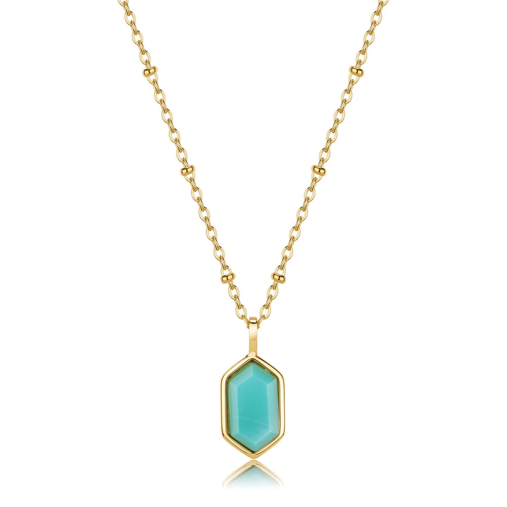 Náhrdelník z chirurgickej ocele s pozláteným povrchom. Náhrdelník je ozdobený prírodným kameňom - amazonitom. Zapínanie náhrdelníka je karabínové. Elegantný dámsky náhrdelník dlhý 45 cm.