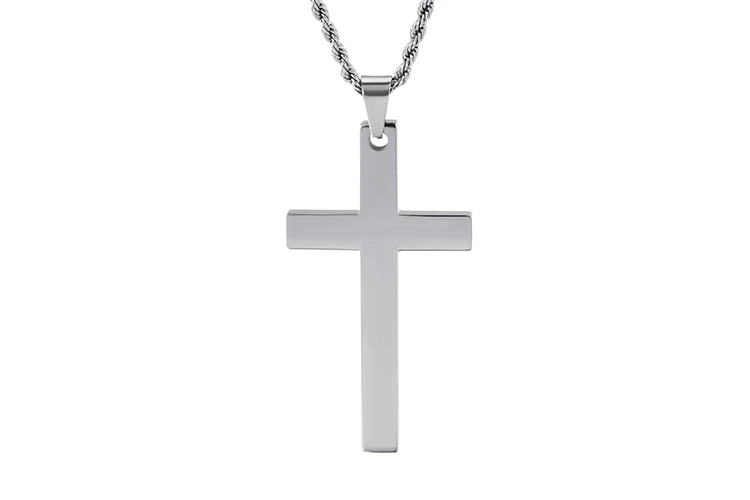Náhrdelník z chirurgickej ocele kríž. Ako všetky oceľové šperky je aj tento náhrdelník v porovnaní so šperkami z iných kovov oceľný proti poškodeniu, nemení farbu, neoxiduje a nevyvoláva alergické reakcie.
