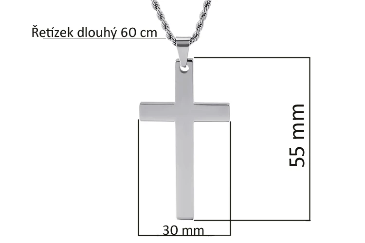 Prívesok z chirurgickej ocele krížik s oceľovou retiazkou typu pancr. Retiazka so zapínaním na karabínu je dlhá 60cm. Rozmer kríža 30x55mm. Prívesok krížik a retiazka majú leštený povrch.