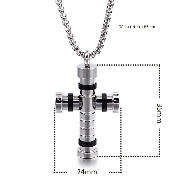 Prívesok z chirurgickej ocele krížik a oceľová retiazka. Povrch krížika aj retiazky je leštený. Retiazka má karabínové zapínanie. Dĺžka retiazky 65cm, priemer 2,3mm. Rozmer Krížiku 24x35mm nájdete zobrazené na podpornej fotografii.