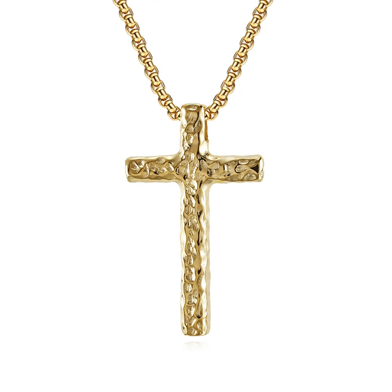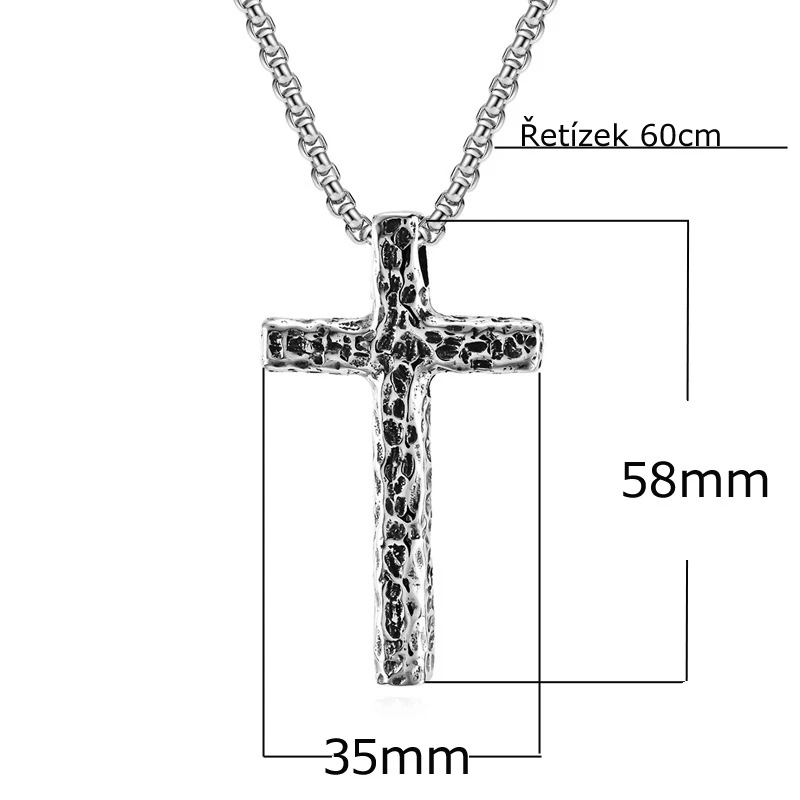 Prívesok z chirurgickej ocele krížik s oceľovou retiazkou. Povrch krížika je leštený pozlátený technológiou PVD. Retiazka s priemerom 3mm je dlhá 60cm, výška krížika 58mm, šírka 35mm.