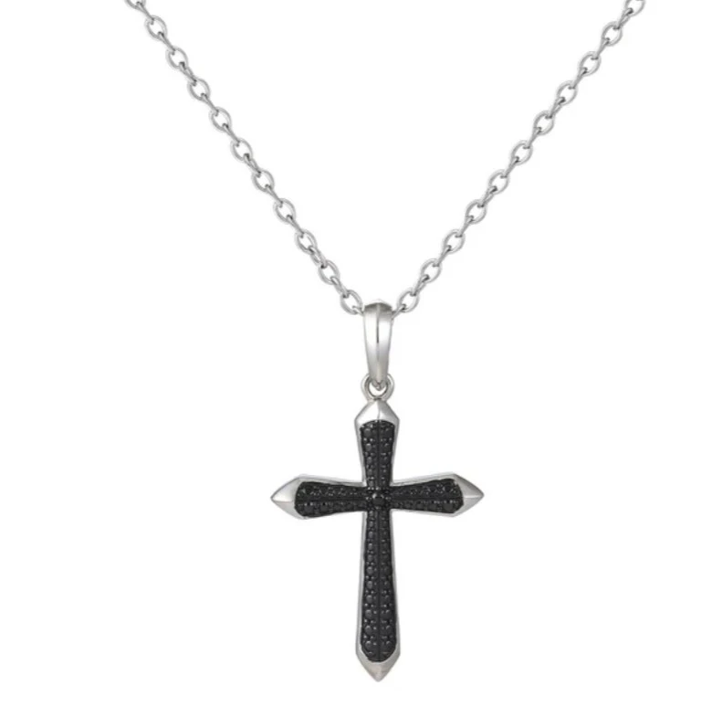 Prívesok z chirurgickej ocele krížik a retiazka predstavujúce nadčasové spojenie v náhrdelník. Povrch krížika je leštený, pohľadová strana prívesku je upravená čiernou PVD farbou a osadená čiernymi zirkónmi. Rozmer krížika 39x26mm. Oceľová retiazka má očká široké 2,6mm, dĺžka retiazky 55cm. Zapínanie retiazky je karabínové.