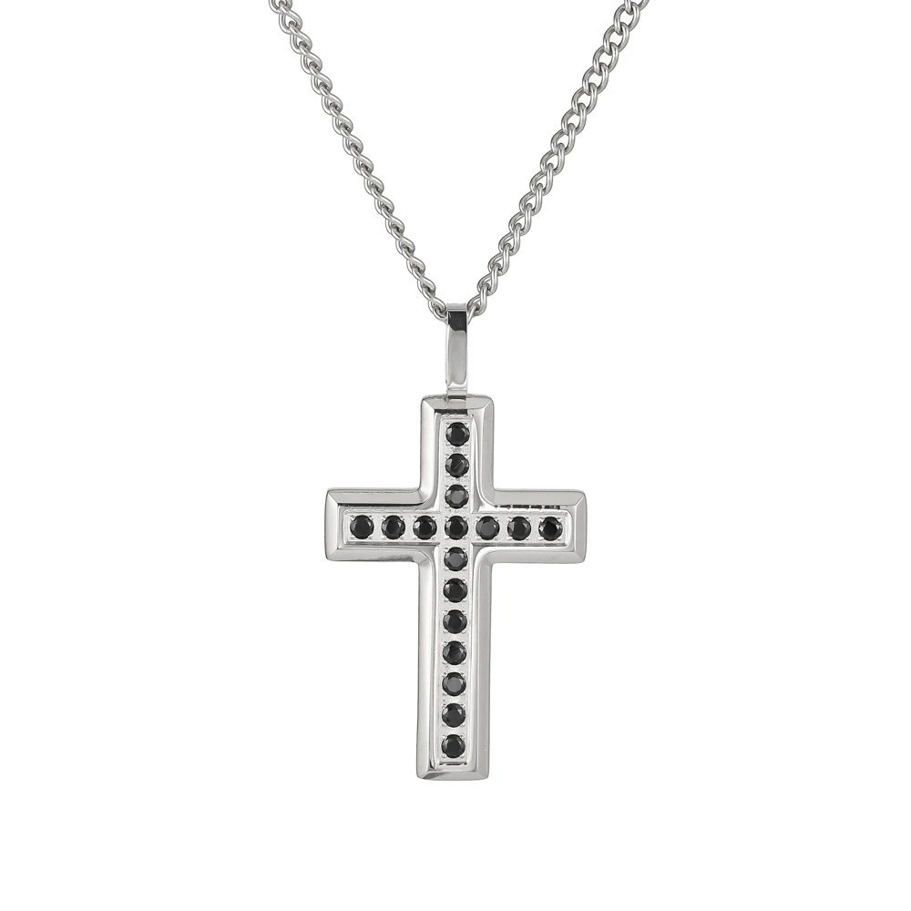 Náhrdelník z chirurgickej ocele tvorený príveskom krížik a jemnou retiazkou. Povrch retiazky je leštený. Prívesok krížik má leštený povrch a je osadený čiernymi zirkónmi. Rozmer krížika: výška vrátane závesného očka 42mm, šírka 23mm. Oceľová retiazka dodávaná k prívesku je dlhá 55 cm. Na prianie je možné retiazku zadarmo skrátiť.