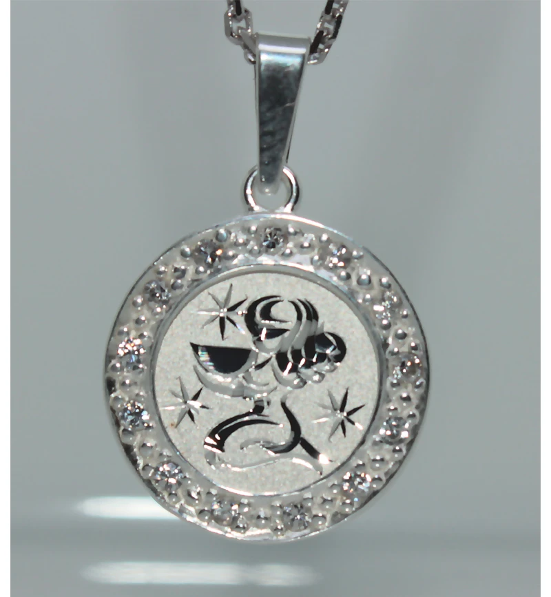 Strieborný prívesok so znamením Panna (24.8-23.9). Priemer prívesku 16 mm. Očkom na prívesku možno pretiahnuť strieborná retiazka s priemerom do 1,5 mm. Vyryté znamenie je dokola ozdobené zirkónmi.