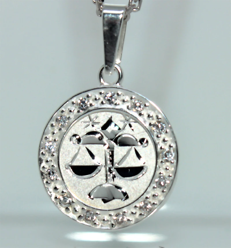 Strieborný prívesok so znamením Váhy (24.9-23.10). Priemer prívesku 16 mm. Očkom na prívesku možno pretiahnuť strieborná retiazka s priemerom do 1,5 mm. Vyryté znamenie je dokola ozdobené zirkónmi.