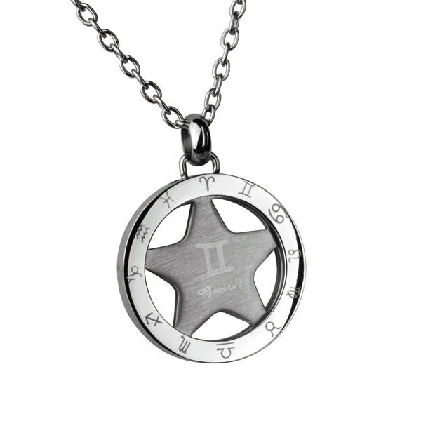 Prívesok z chirurgickej ocele so znamením Blíženci (22.5 - 21.6). Znamenie je umiestnené do stredu matnej hviezdy, ktorá sa otáča v leštenom orámovaní, na ktorom sú zobrazené symboly všetkých znamení horoskopu. Priemer prívesku 25mm.