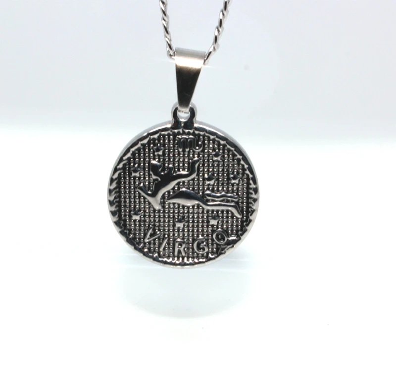 Prívesok z chirurgickej ocele so znamením Panny (23. august - 22. september). Znamenie Panny je vyrazené na čiernom a striebornom pozadí. Priemer prívesku 25 mm. K prívesku so znamením je pripojená 60 cm dlhá retiazka z chirurgickej ocele.