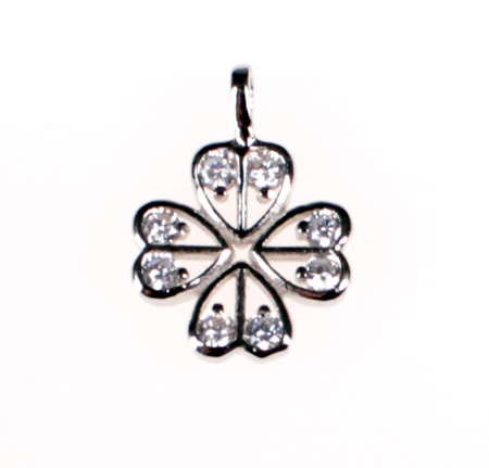 Strieborný prívesok štvorlístok zdobený zirkónmi. Povrch štvorlístka je porodiovaný. Rozmer prívesku 11 × 11mm, očkom pre zavesenie možno prevliecť retiazka s priemerom do 2mm.