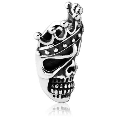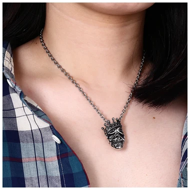 Prívesok lebka s korunou zhotovený z chirurgickej ocele. Povrch prívesku je leštený s kalenými detailmi. Rozmer prívesku 36x23x14 mm. Prívesok možno zavesiť na oceľový retiazka s maximálnym priemerom 5 mm.