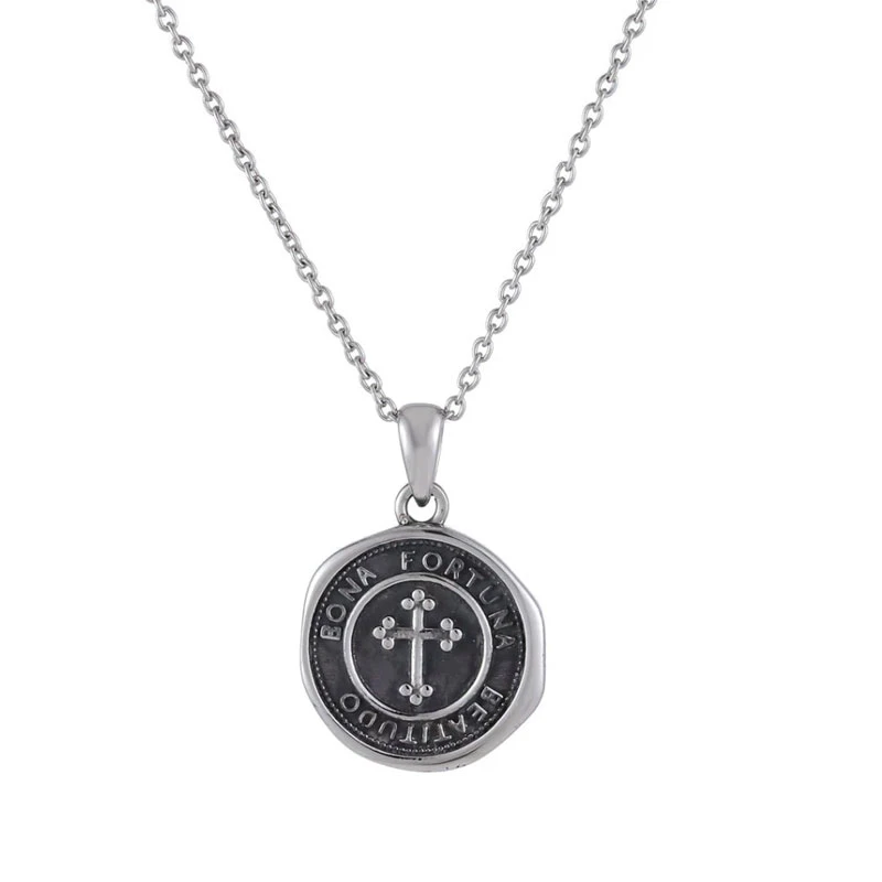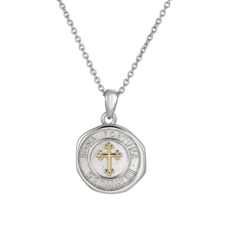 Prívesok na retiazku z chirurgickej ocele mince. Prívesok je ozdobený krížom a nápisom "Bona Fortuna Beatitudo". K prívesku patrí retiazka z chirurgickej ocele dlhá 55 cm. Priemer prívesku 18 mm.