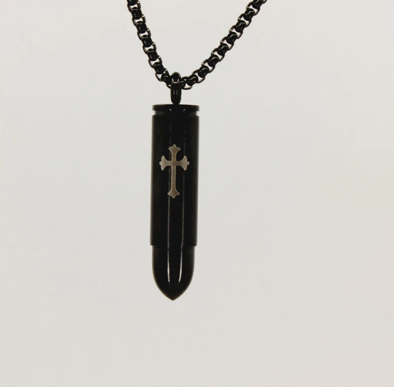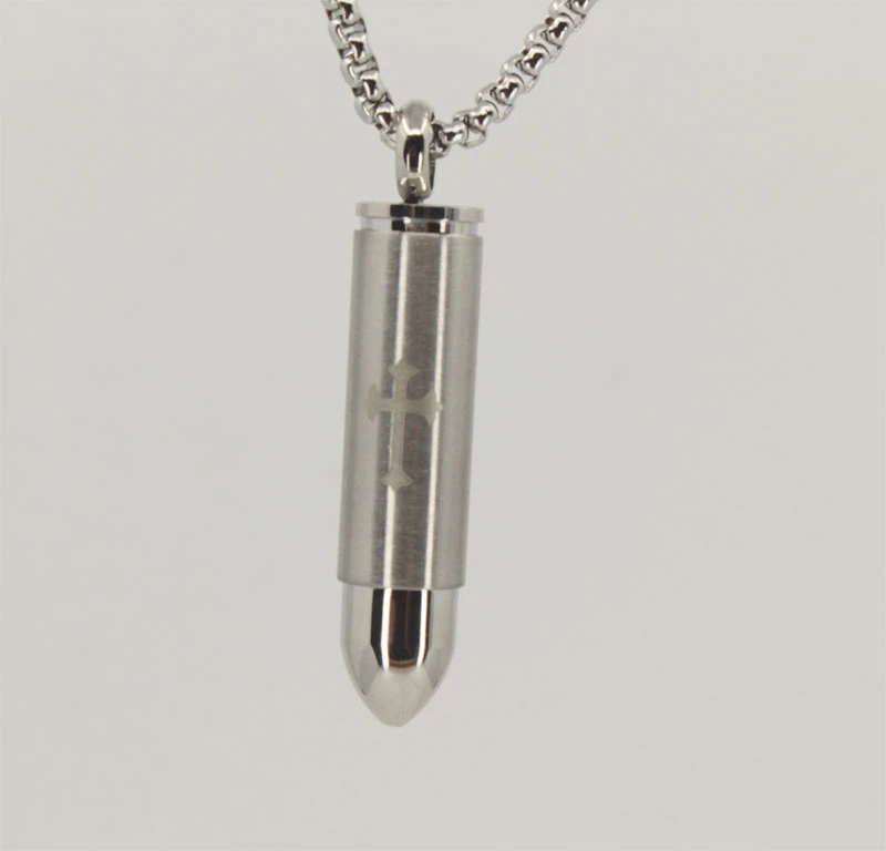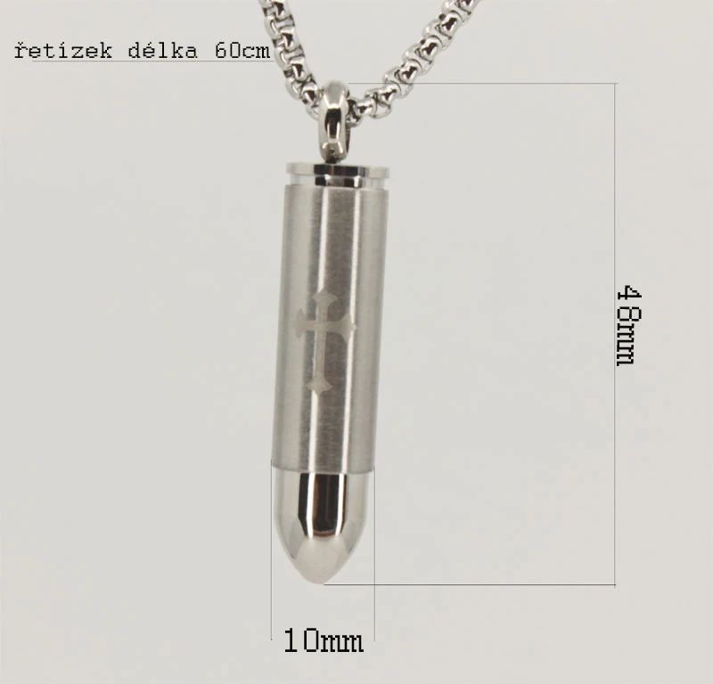 Prívesok na retiazku z chirurgickej patróna, povrch nábojnice je matný s ozdobou krížika, povrch projektilu je leštený. Spodnú časť nábojnice s okom je možné odskrutkovať. Priemer nábojnice: 10mm, dĺžka: 48mm. Očkom možno pretiahnuť retiazku s priemerom do 5mm.
