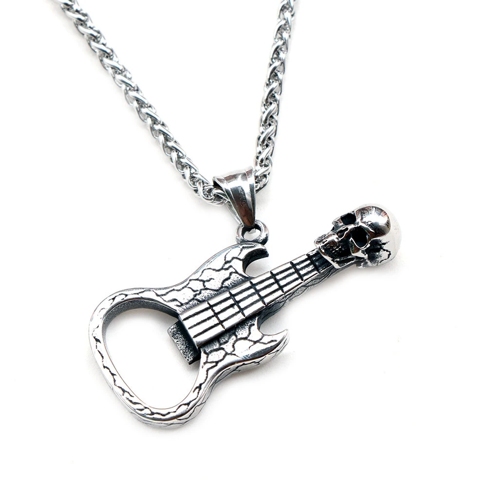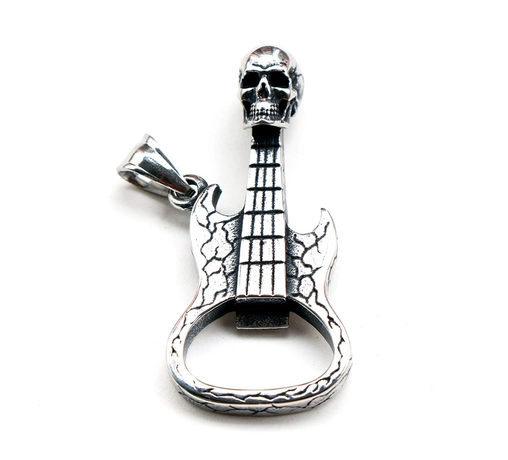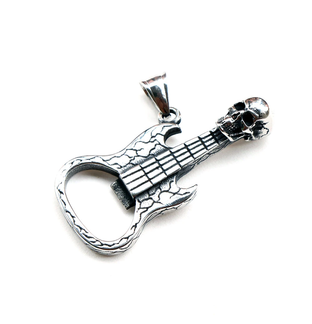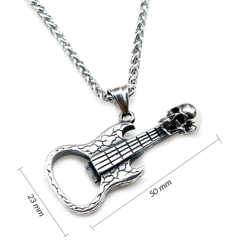 Prívesok v tvare gitary z chirurgickej ocele. K prívesku patrí oceľová retiazka vzoru anker dlhý 60cm. Prívesok je možné používať ako otvárač. Rozmer prívesku 50 x 23 mm.