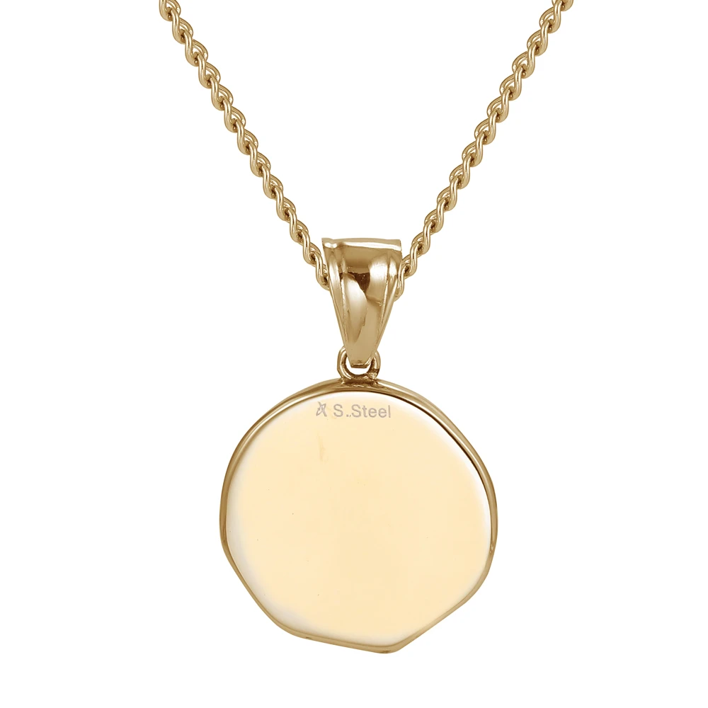 Pozlátený prívesok na retiazku z chirurgickej ocele. Priemer prívesku 22mm. Závesným očkom na prívesku je možné prevliecť retiazku s maximálnym priemerom 4,5mm. K prívesku patrí pozlátená retiazka z chirurgickej ocele vzor pancre široký 2mm, dlhý 50cm.