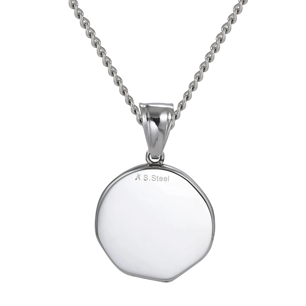 Prívesok na retiazku z chirurgickej ocele. Priemer prívesku 22mm. Závesným očkom na prívesku je možné prevliecť retiazku s maximálnym priemerom 4,5mm. K prívesku patrí retiazka z chirurgickej ocele vzor ankr široký 2,5mm, dlhý 55cm.
