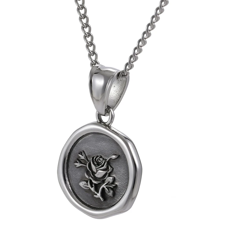 Prívesok na krk z chirurgickej ocele s motívom ružového kvetu. Plastický kvet ruže je umiestnený na matnom podklade v leštenom orámovaní. Zadná strana prívesku a závesné očko majú leštený povrch. Priemer prívesku 20mm. K prívesku patrí retiazka z chirurgickej ocele dlhá 55cm. Dĺžku retiazky je možné na prianie zadarmo skrátiť.