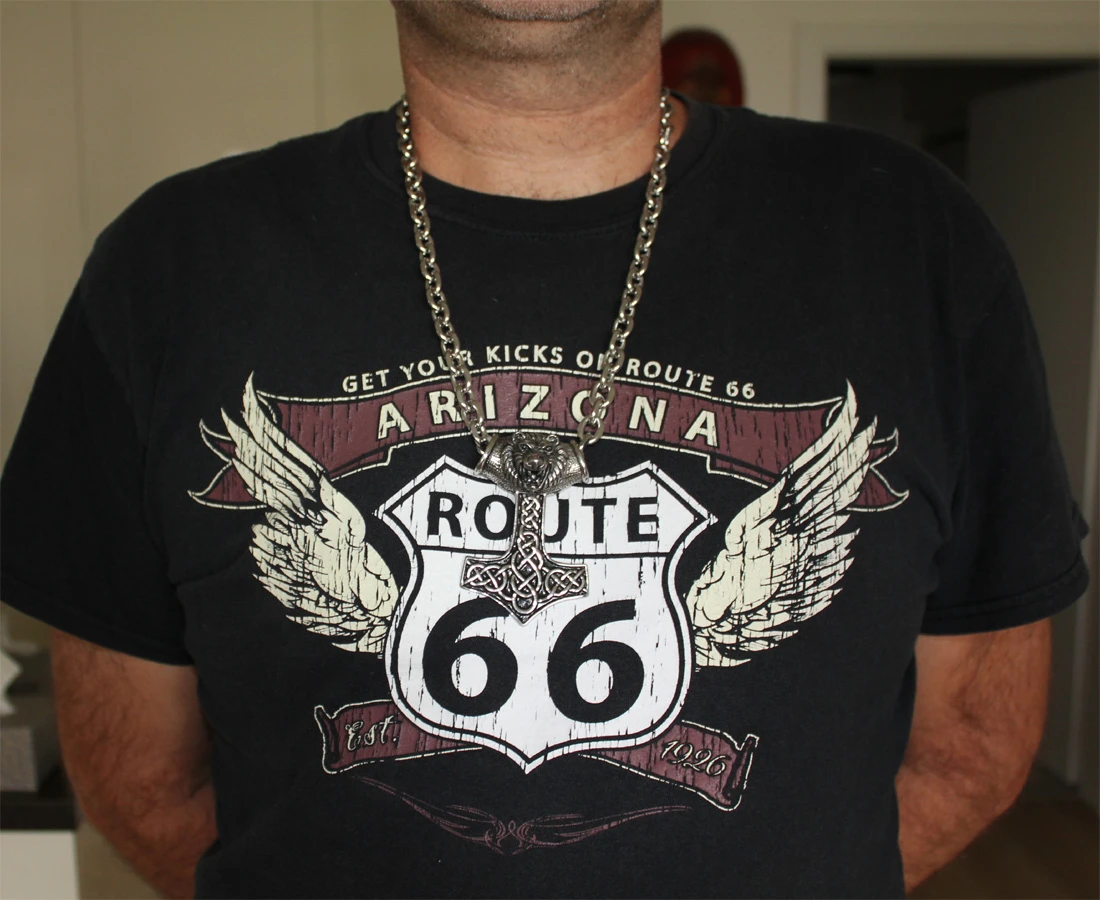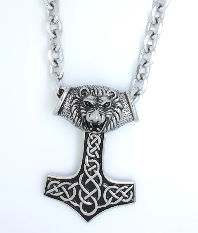 Oceľový prívesok Thórovo kladivo s reťazou o dĺžke 70 cm. Reťaz je široká 11 mm. Rozmer prívesku 81x55 mm. Povrch Thórovho kladiva je zdobený plastikami s čiernou patinou.