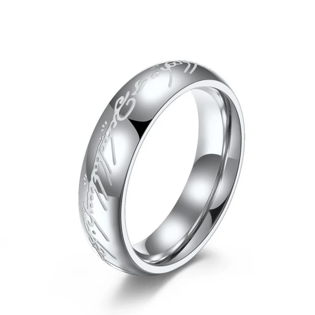 Oceľový prsteň moci s rytým textom na vonkajšej strane prsteňa.