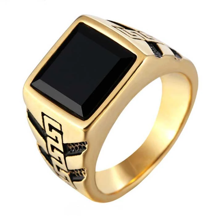 Oceľový pečatný prsteň s čiernym umelým kameňom. Povrch prsteňa je pozlátený technológiou PVD doplnený čiernym vzorom meadru. Obrúčka prsteňa je v najužšom mieste široká 3,4 mm a plynulo sa rozširuje na 11,5 mm. Rozmer ozdoby s kameňom 12x12mm.