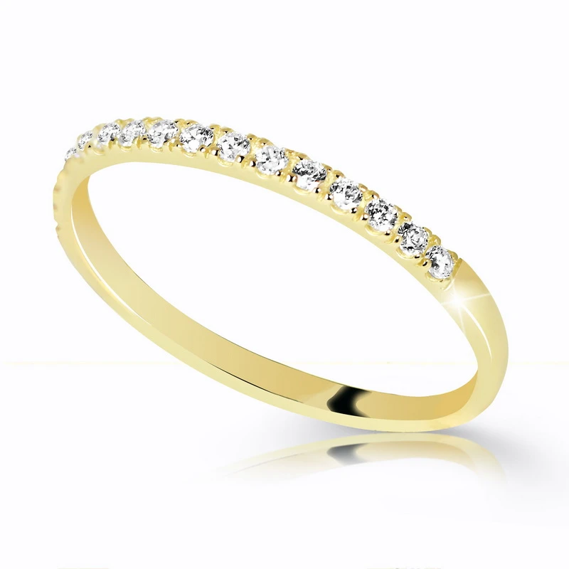 Prstienok zo žltého zlata zdobený zirkónmi. Obrúčka prsteň je široká 1,8 mm.