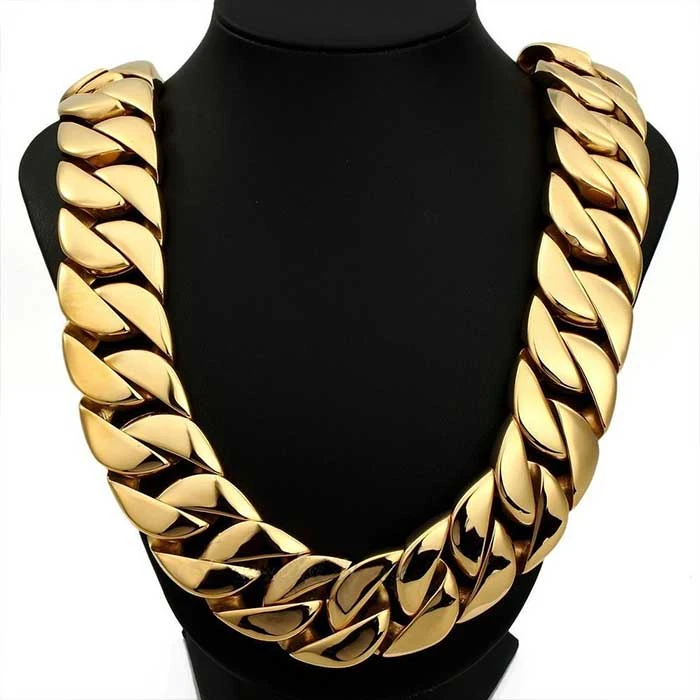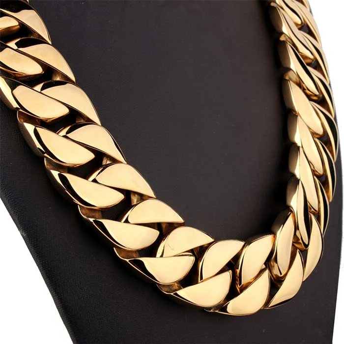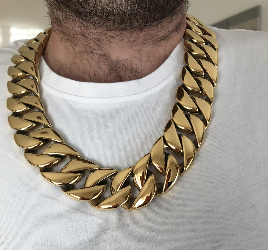 Masívny oceľový retiazka s lešteným povrchom pozláteným technológií IP. Reťaz na krk dlhý 70cm, šírka 32mm. Zapínanie retiazky je na masívny klip. Veľmi masívny oceľový retiazka na krk. Hmotnosť reťaze 860g.