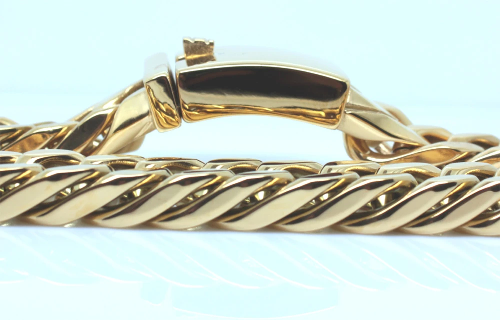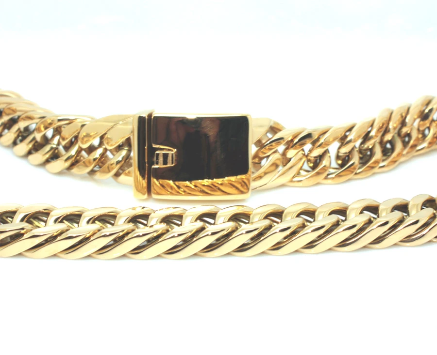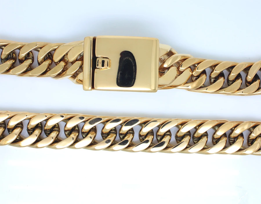 Masívna oceľová retiazka s lešteným pozláteným povrchom technológiou IP. Reťaz na krk dlhý 60cm, šírka 15mm, hrúbka 7mm. Zapínanie retiazky je na masívny klip. Robusná oceľová retiazka na krk. Hmotnosť reťaze 285g.