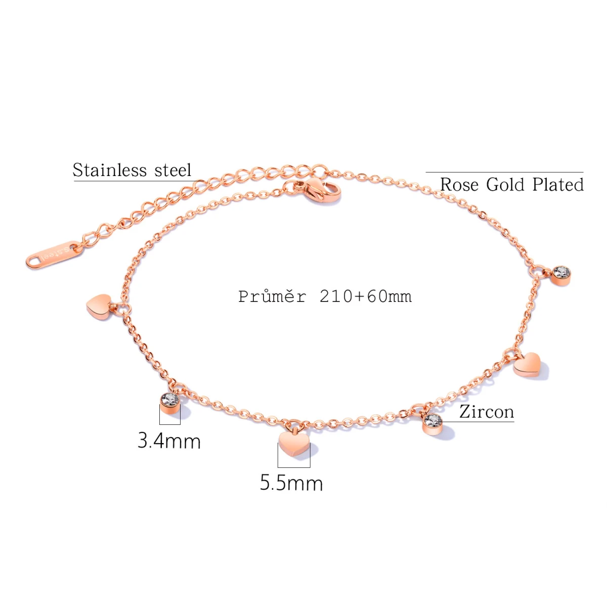 Náramok na členok z chirurgickej ocele. Povrch náramku je leštený vo farbe ocele, alebo upravený IP farbou ružového zlata. Dĺžku retiazky možno plynulo nastaviť v rozmedzí 21-27cm. Zapínanie náramku na členok je karabínové.