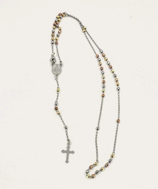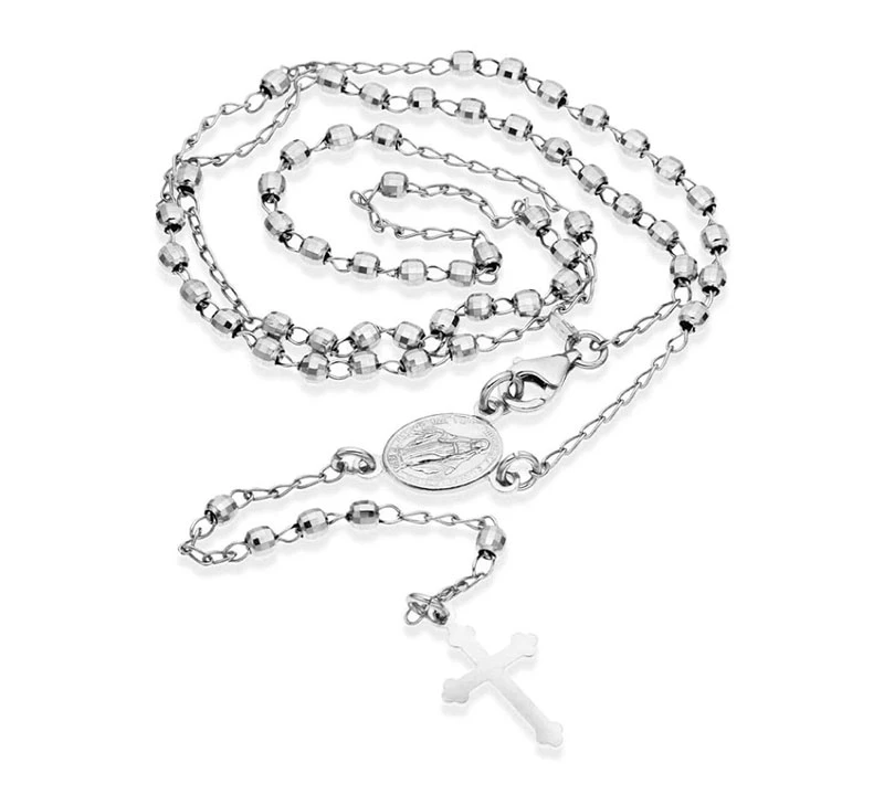 Ruženec vyrobený zo striebra 925/1000. Povrch ruženca je porhodiovaný. Úprava povrchu rhodiovaním dodáva ružencii jasnú farbu s leskom, chráni povrch proti poškriabaniu a zamedzuje prirodzenej oxidácii striebra. Časť ruženca, ktorú zapíname okolo krku je dlhá 53cm. Časť ruženca tvoriaca prívesok ukončená krížom je dlhá 10cm. Korálky majú priemer 3mm.