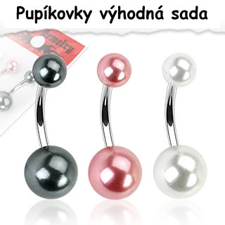 Sada piercingu pupku. Sada obsahuje 3ks piercingu pupku. Každý piercing má driek z chirurgickej ocele 316L. Driek piercingu má priemer 1,6 mm, dĺžka drieku 10mm. Vrchná gulička má priemer 5mm, dolný gulička má priemer 8mm. Povrch guličiek imituje perleť.