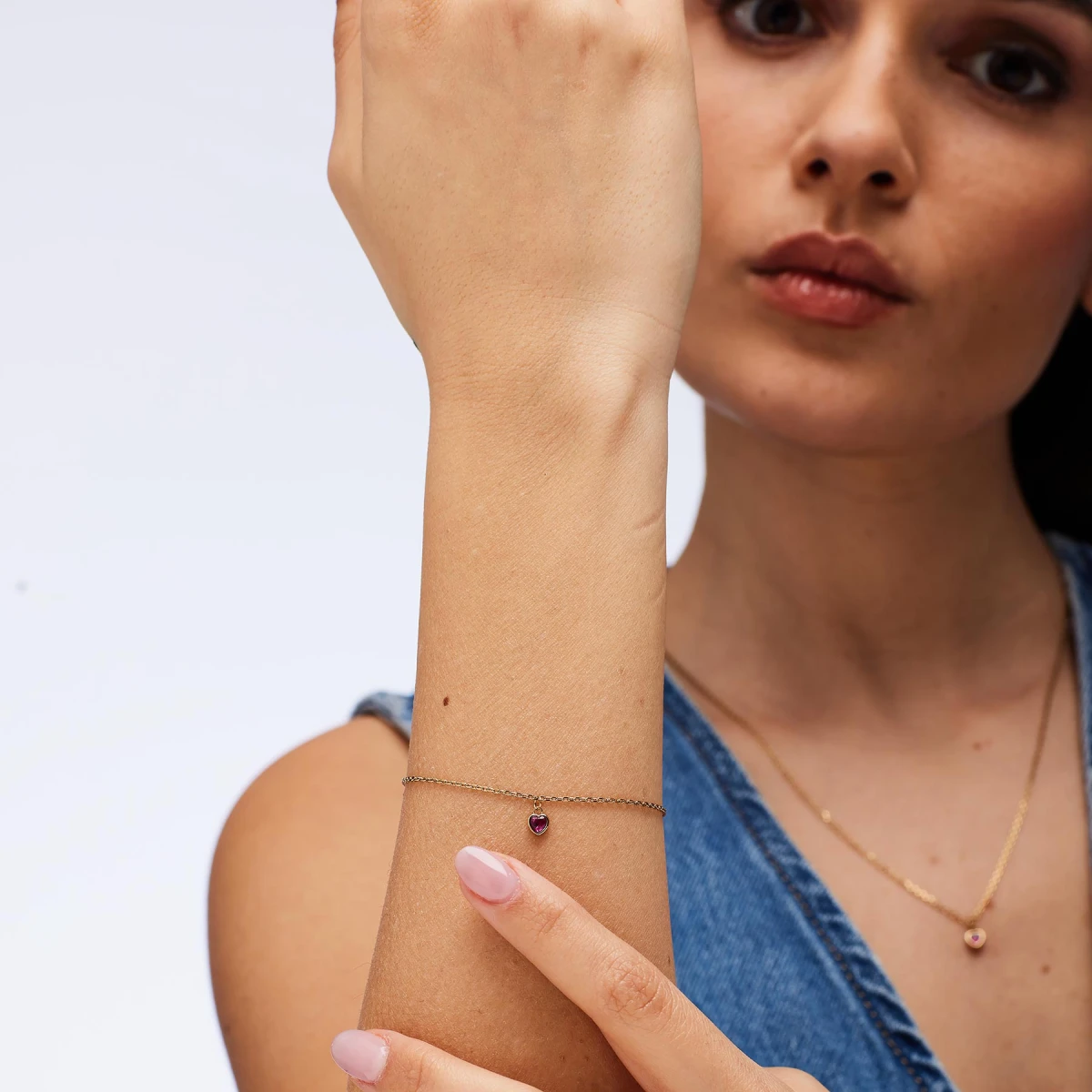 Náramok z chirurgickej ocele a náhrdelník z chirurgickej ocele v sade. Šperky majú povrch pozlátený technológiou PVD. Prívesky v tvare srdiečka sú osadené tmavo červenými kryštálmi. Náramok je dlhý 19cm. Dĺžka náhrdelníka 50cm.