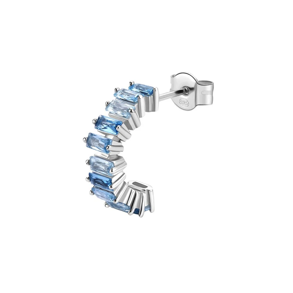 Strieborná náušnice polokrúžok. Náušnica je vyrobená zo striebra rýdzosti 925/1000 a osadená prvotriednymi zirkónmi. Povrch náušnice je porhodiovaný. Nanesené ródium dodáva náušnici jasnú farbu s leskom a zaisťuje jej dlhodobý bezchybný vzhľad. Náušnicové zapínanie je na puzetku. Uvedená cena platí za jednu náušnicu.