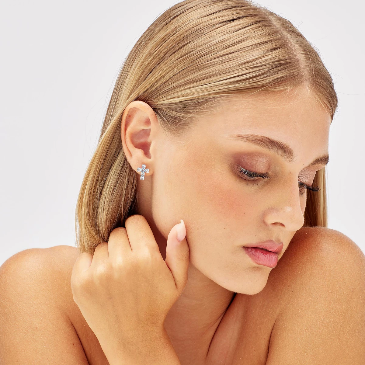 Strieborná náušnice krížik. Náušnica je vyrobená zo striebra rýdzosti 925/1000 a osadená prvotriednymi zirkónmi. Povrch náušnice je porhodiovaný. Nanesené ródium dodáva náušnici jasnú farbu s leskom a zaisťuje jej dlhodobý bezchybný vzhľad. Náušnicové zapínanie je kĺbové. Uvedená cena platí za jednu náušnicu.