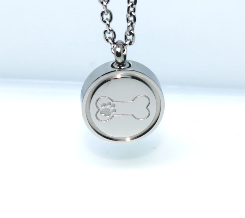 Smútočný prívesok z chirurgickej ocele. V prívesku je možné uchovať popol, či srsť zosnulého psíka. Priemer prívesku 19mm, výška aj so závesným očkom 25mm. K prívesku patrí retiazka z chirurgickej ocele vzor anker dlhý 60cm. Dĺžku retiazky je možné na prianie zadarmo skrátiť.