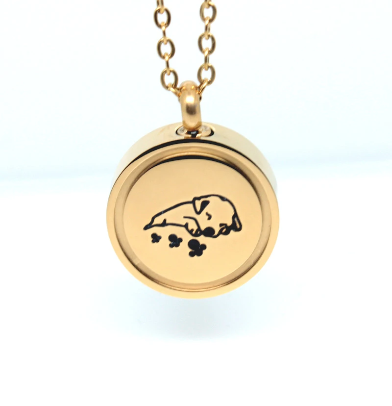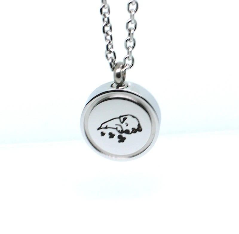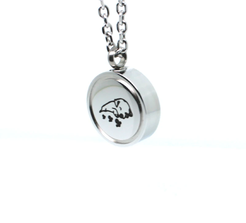 Smútočný prívesok z chirurgickej ocele. V prívesku je možné uchovať popol, či srsť zosnulého psíka. Priemer prívesku 19mm, výška aj so závesným očkom 25mm. K prívesku patrí retiazka z chirurgickej ocele vzor anker dlhý 60cm. Dĺžku retiazky je možné na prianie zadarmo skrátiť.