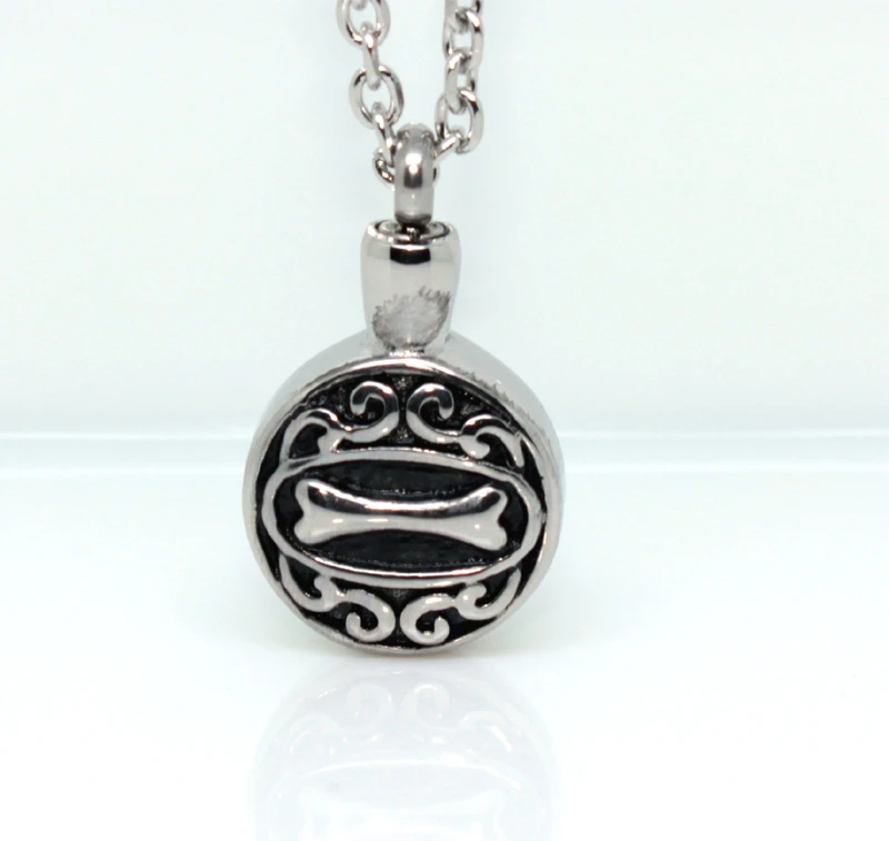 Smútočný prívesok z chirurgickej ocele. V prívesku je možné uchovať popol, čí srsť zosnulého psíka. Priemer prívesku 19mm, výška aj so závesným očkom 30mm. K prívesku patrí retiazka z chirurgickej ocele vzor anker dlhý 60cm. Dĺžku retiazky je možné na prianie zadarmo skrátiť.