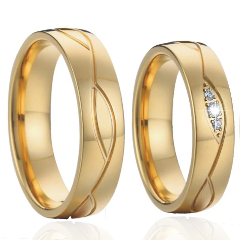 Snubné prstene z chirurgickej ocele. Pozlátený povrch prsteňov je leštený so vzorom. Dámske prstienky vo veľkostiach 49-57 sú osadené fasovanými zirkónmi. Pánske prstene vo veľkostiach 59-70 sú bez zirkónov. Prstienky sú široké 5mm. Uvedená cena je za jeden svadobný prsteň. Dámský snubný prsteň s kameňmi je za inú cenu ako pánsky svadobný prsteň bez kameňov.