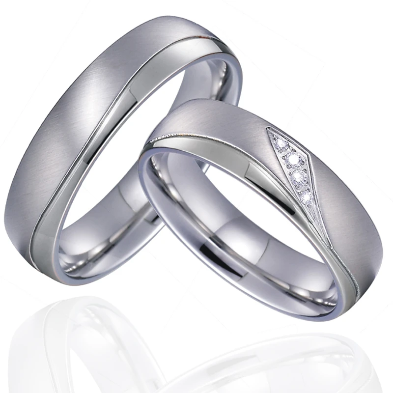 Snubné prstene z chirurgickej ocele. Dámske prstienky vo veľkostiach 49-57 sú osadené fasovanými zirkónmi. Pánske prstene vo veľkostiach 59-70 sú bez zirkónov. Svadobné prstene široké 6 mm. Uvedená cena je za jeden svadobný prsteň. Dámský snubný prsteň s kameňmi je za inú cenu ako pánsky svadobný prsteň bez kameňov.