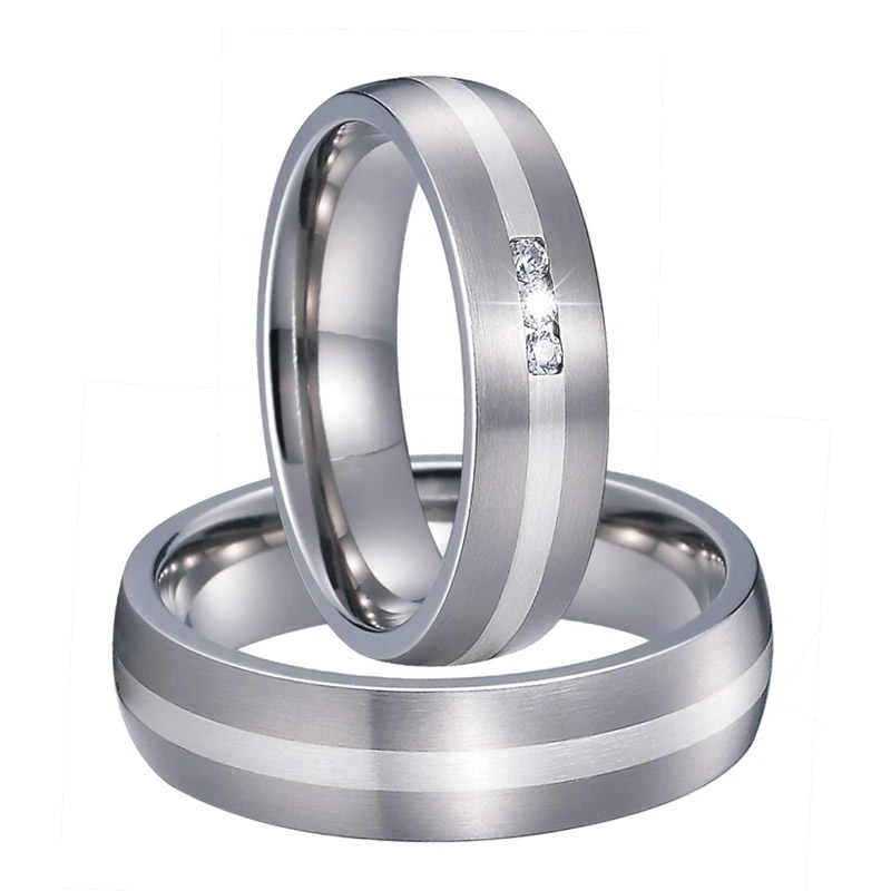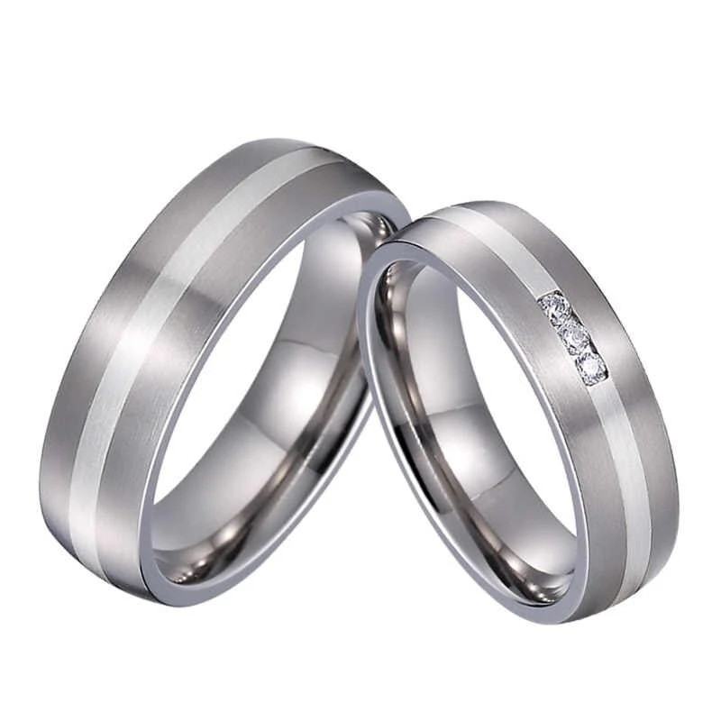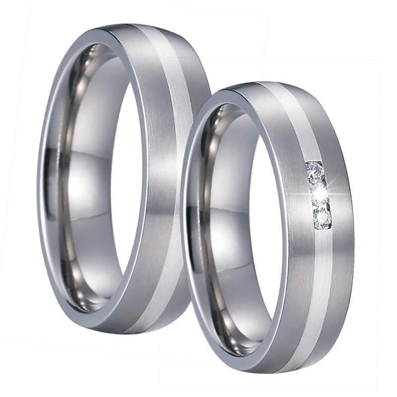 Titánové snubné prstene. Prstene sú široké 6 mm. Snubné prstienky vo veľkostiach 49-57 sú osadené zirkónmi (u tohto vzoru je možnosť veľkosti 57 bez zirkónov). Snubné prstene vo veľkostiach 59-67 sú bez kamienkov. Uvedená cena platí za jeden snubný prsteň. Za snubný prsteň so zirkónmi platí iná cena, než za snubný prstienok bez zirkónov.